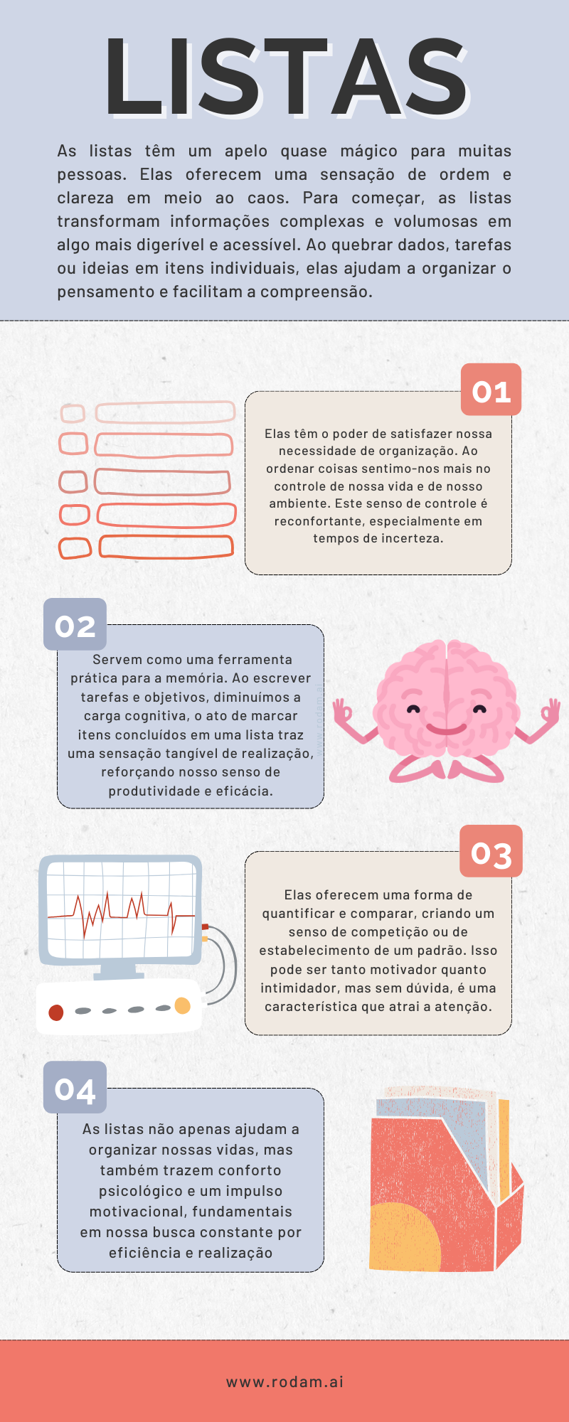 Em um mundo frequentemente caótico e imprevisível, proporcionam uma sensação de ordem e estrutura, oferecendo um senso tangível de progresso e realização à medida que itens são verificados. Este aspecto é reforçado pelo efeito de recompensa: ao marcar itens concluídos, nosso cérebro libera dopamina, um neurotransmissor associado à sensação de prazer e satisfação. Portanto, as listas não apenas ajudam a organizar nossas vidas, mas também trazem conforto psicológico e um impulso motivacional, fundamentais em nossa busca constante por eficiência e realização.