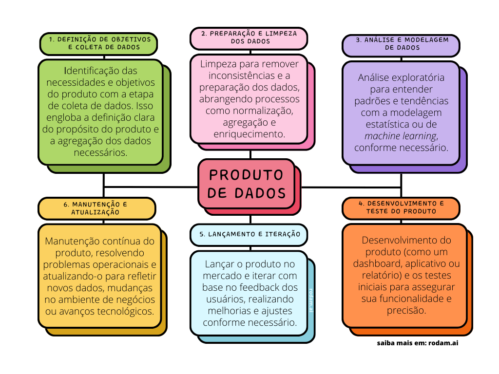 As etapas do ciclo de vida de um produto de dados, que é um pouco diferente do ciclo de vida de um produto físico convencional, podem ser detalhadas da seguinte maneira: