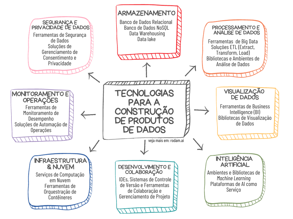 Uma estratégia adicional é contar com um arcabouço moderno de ferramentas. Hoje o mercado possui diversas plataformas para a construção e gerenciamento de produtos de dados, cada projeto deve avaliar quais os requisitos que farão optar pelo uso de cada ferramenta, segue uma visão macro de quais tecnologias podem estar envolvidas nessas escolhas. Veja: