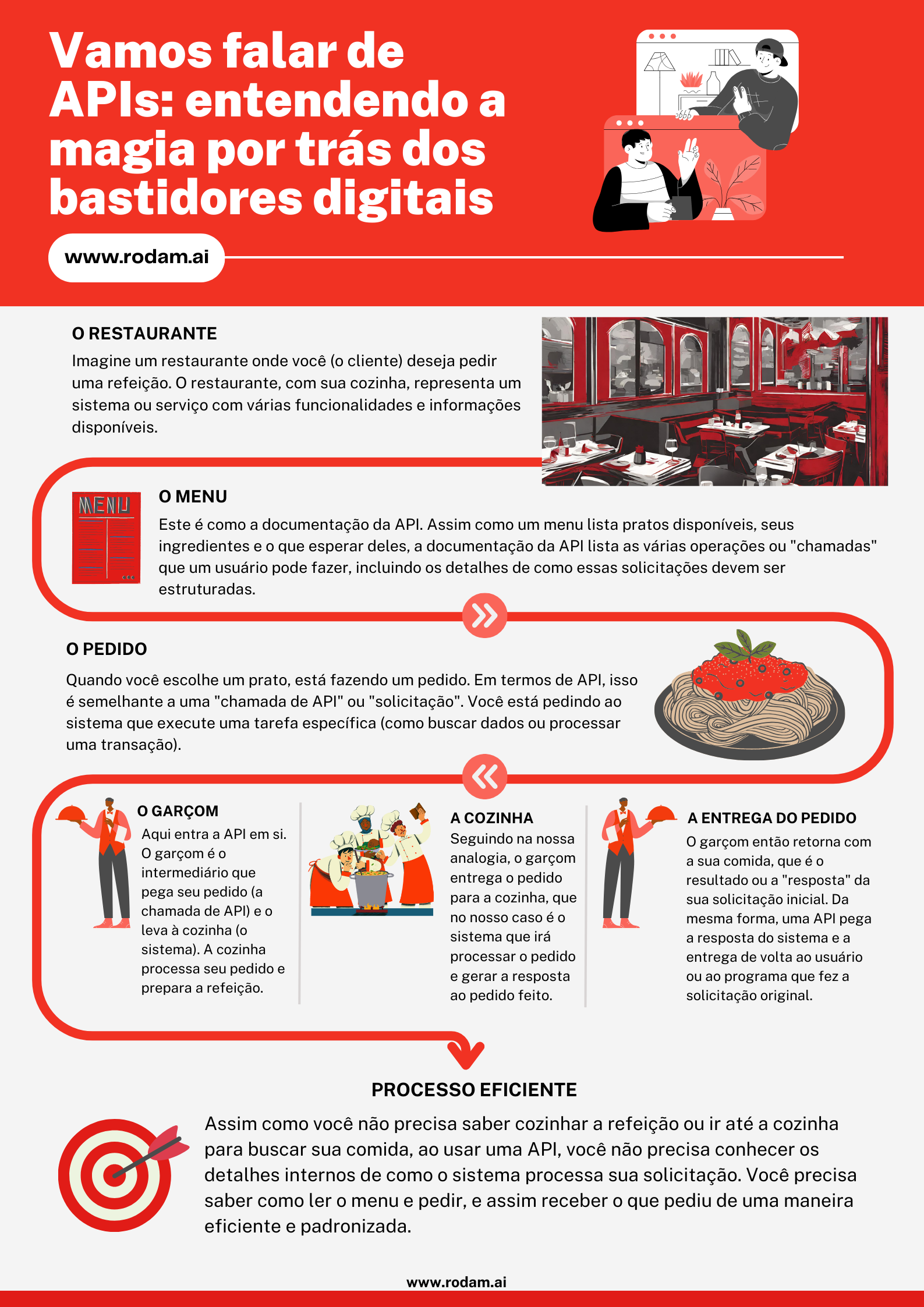 Uma maneira eficaz de entender o que é uma API - Application Programming Interface ou Interface de Programação de Aplicações é através da analogia de um restaurante: